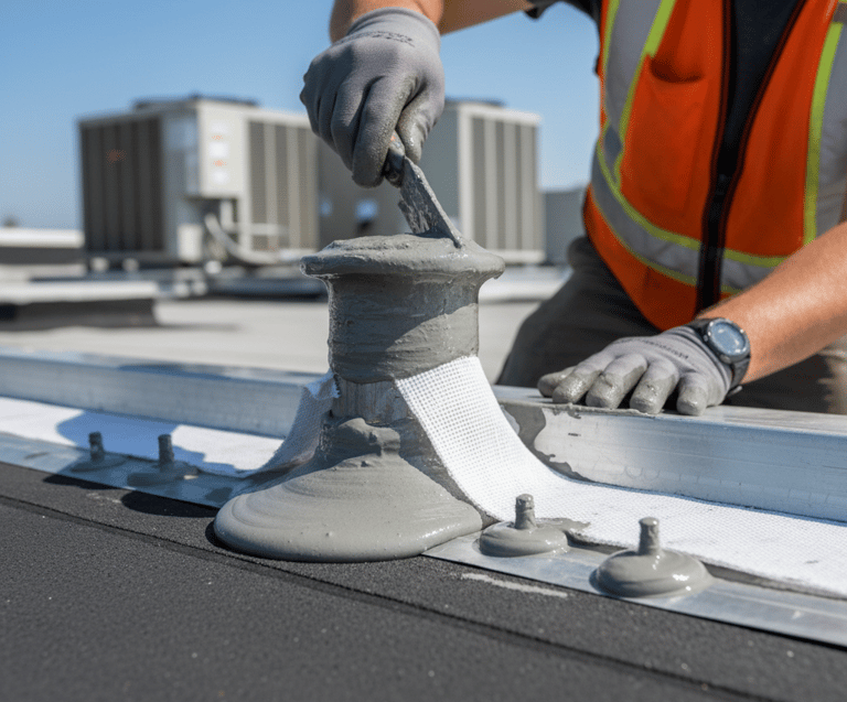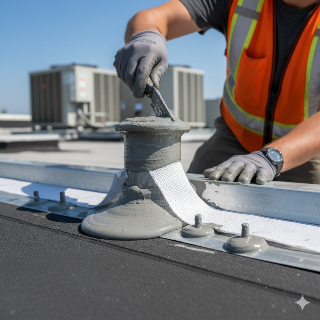 Seams, penetrations, flashing, fasteners, and transition points are reinforced and repaired using compatible materials prior to coating application.